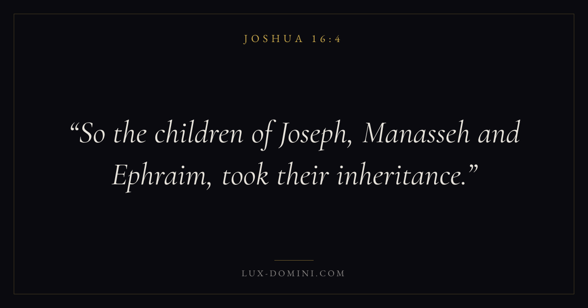 Books / Joshua / Chapter 16 / Verse 4 ← Joshua 16:3 Joshua 16:4 Joshua 16:5 → So the children of Joseph, Manasseh and Ephraim, took their inheritance. Download verse card Share on Twitter Share on Facebook Pin it ✦ Key themes PeaceInheritanceRestCovenant fidelity Read with Joshua 16:1Joshua 16:2John 14:27Philippians 4:7 Related topics Bible verses about peaceBible verses about rest and weariness ✦ Joshua Chapter 16 verses V. 1 V. 2 V. 3 V. 4 V. 5 V. 6 V. 7 V. 8 V. 9 V. 10