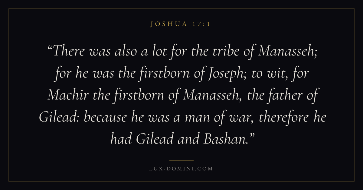 There was also a lot for the tribe of Manasseh; for he was the firstborn of Joseph; to wit, for Machir the firstborn of Manasseh, the father of Gilead: because he was a man of war, therefore he had Gilead and Bashan.