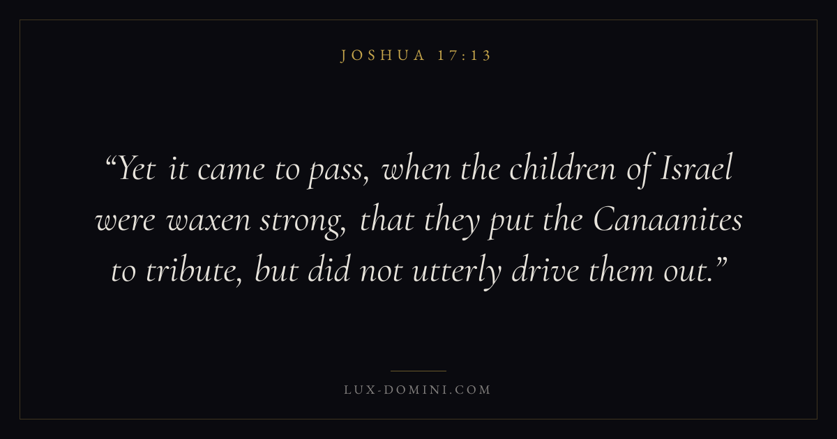 Yet it came to pass, when the children of Israel were waxen strong, that they put the Canaanites to tribute, but did not utterly drive them out.