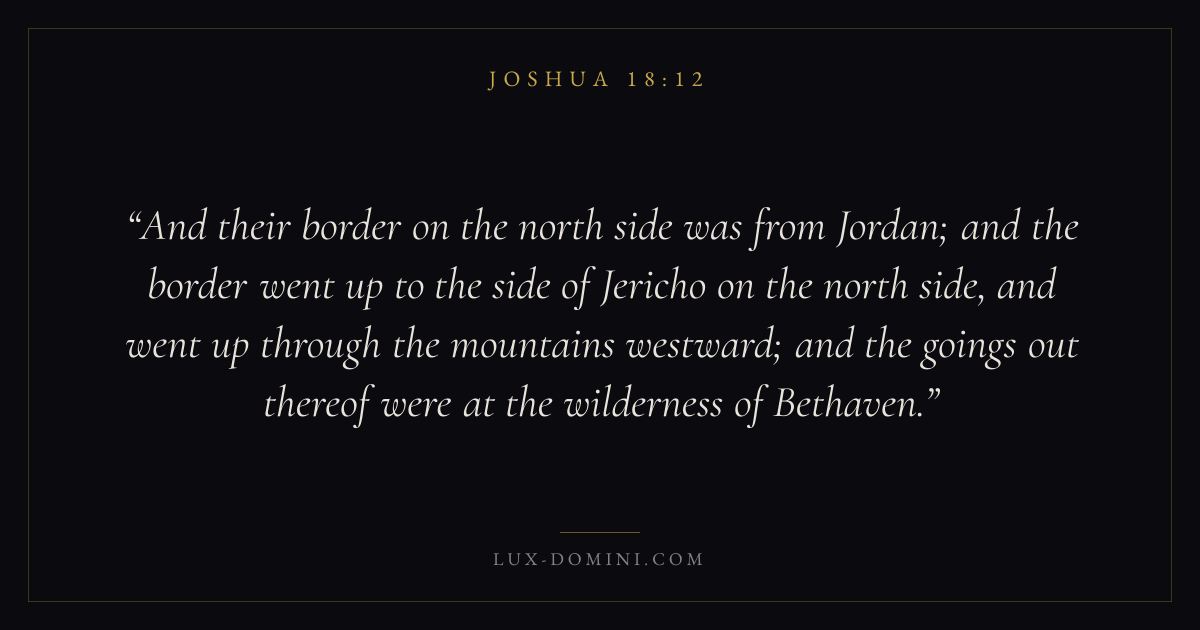 And their border on the north side was from Jordan; and the border went up to the side of Jericho on the north side, and went up through the mountains westward; and the goings out thereof were at the wilderness of Bethaven.