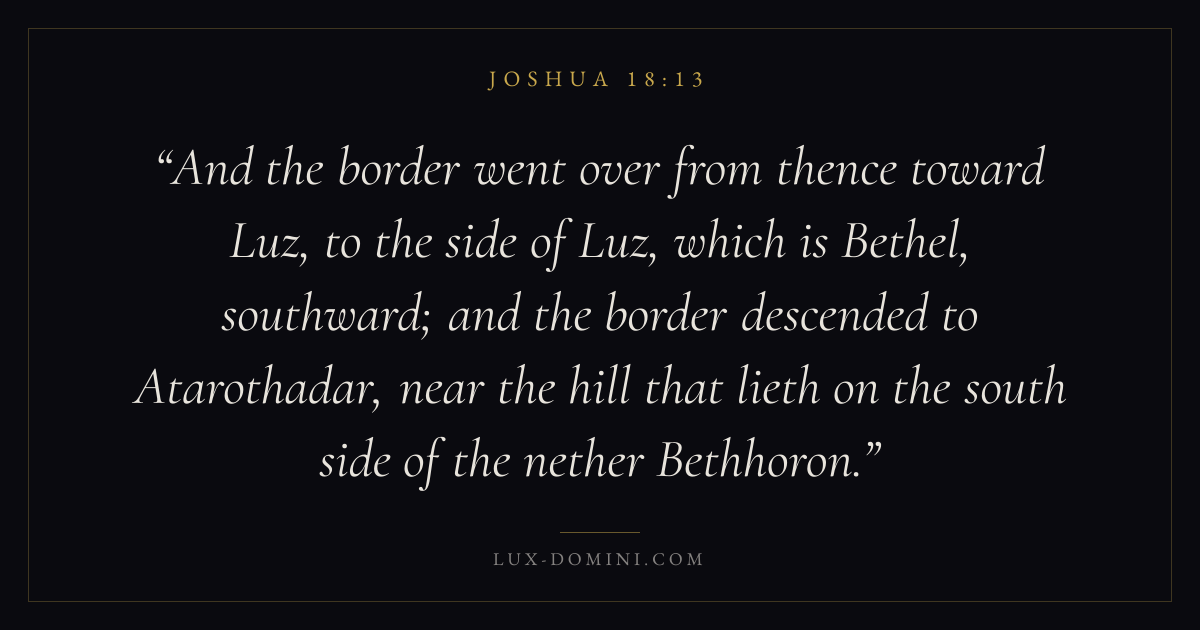 And the border went over from thence toward Luz, to the side of Luz, which is Bethel, southward; and the border descended to Atarothadar, near the hill that lieth on the south side of the nether Bethhoron.