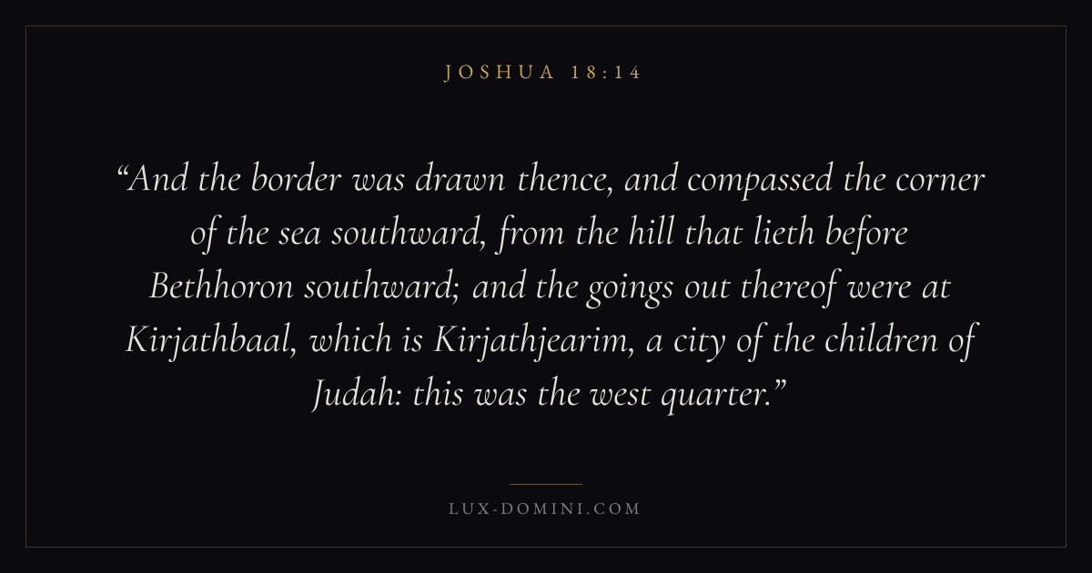 And the border was drawn thence, and compassed the corner of the sea southward, from the hill that lieth before Bethhoron southward; and the goings out thereof were at Kirjathbaal, which is Kirjathjearim, a city of the children of Judah: this was the west quarter.