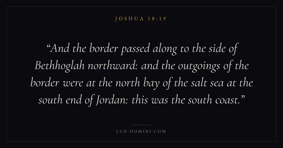 And the border passed along to the side of Bethhoglah northward: and the outgoings of the border were at the north bay of the salt sea at the south end of Jordan: this was the south coast.