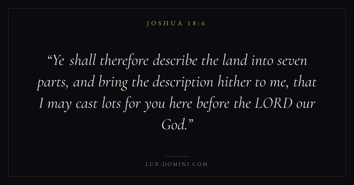 Ye shall therefore describe the land into seven parts, and bring the description hither to me, that I may cast lots for you here before the LORD our God.