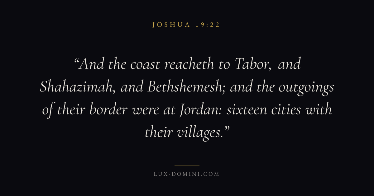 And the coast reacheth to Tabor, and Shahazimah, and Bethshemesh; and the outgoings of their border were at Jordan: sixteen cities with their villages.