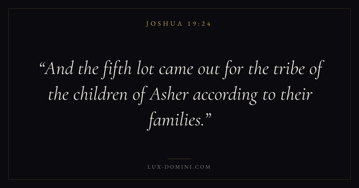 Books / Joshua / Chapter 19 / Verse 24 ← Joshua 19:23 Joshua 19:24 Joshua 19:25 → And the fifth lot came out for the tribe of the children of Asher according to their families. Download verse card Share on Twitter Share on Facebook Pin it ✦ Key themes PrayerPeaceInheritanceRest Read with Joshua 19:25Joshua 19:26Matthew 6:9Luke 18:1 Related topics Bible verses about prayerBible verses about peaceBible verses about rest and weariness ✦ Joshua Chapter 19 verses V. 1 V. 2 V. 3 V. 4 V. 5 V. 6 V. 7 V. 8 V. 9 V. 10 V. 11 V. 12 V. 13 V. 14 V. 15 V. 16 V. 17 V. 18 V. 19 V. 20 V. 21 V. 22 V. 23 V. 24 V. 25 V. 26 V. 27 V. 28 V. 29 V. 30 V. 31 V. 32 V. 33 V. 34 V. 35 V. 36 V. 37 V. 38 V. 39 V. 40 V. 41 V. 42 V. 43 V. 44 V. 45 V. 46 V. 47 V. 48 V. 49 V. 50 V. 51