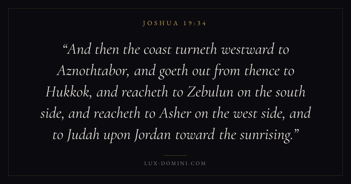 And then the coast turneth westward to Aznothtabor, and goeth out from thence to Hukkok, and reacheth to Zebulun on the south side, and reacheth to Asher on the west side, and to Judah upon Jordan toward the sunrising.
