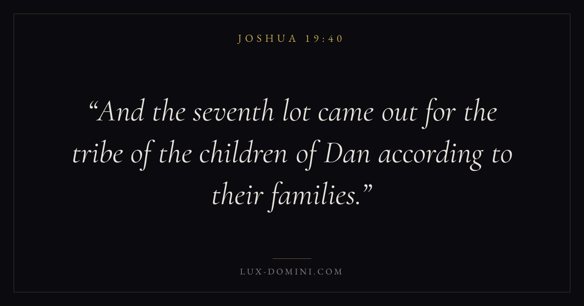 Books / Joshua / Chapter 19 / Verse 40 ← Joshua 19:39 Joshua 19:40 Joshua 19:41 → And the seventh lot came out for the tribe of the children of Dan according to their families. Download verse card Share on Twitter Share on Facebook Pin it ✦ Key themes PrayerPeaceInheritanceRest Read with Joshua 19:41Joshua 19:42Matthew 6:9Luke 18:1 Related topics Bible verses about prayerBible verses about peaceBible verses about rest and weariness ✦ Joshua Chapter 19 verses V. 1 V. 2 V. 3 V. 4 V. 5 V. 6 V. 7 V. 8 V. 9 V. 10 V. 11 V. 12 V. 13 V. 14 V. 15 V. 16 V. 17 V. 18 V. 19 V. 20 V. 21 V. 22 V. 23 V. 24 V. 25 V. 26 V. 27 V. 28 V. 29 V. 30 V. 31 V. 32 V. 33 V. 34 V. 35 V. 36 V. 37 V. 38 V. 39 V. 40 V. 41 V. 42 V. 43 V. 44 V. 45 V. 46 V. 47 V. 48 V. 49 V. 50 V. 51