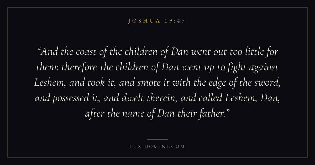 And the coast of the children of Dan went out too little for them: therefore the children of Dan went up to fight against Leshem, and took it, and smote it with the edge of the sword, and possessed it, and dwelt therein, and called Leshem, Dan, after the name of Dan their father.