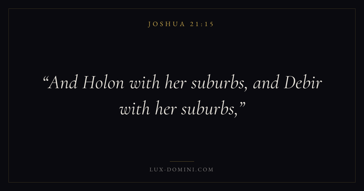 Books / Joshua / Chapter 21 / Verse 15 ← Joshua 21:14 Joshua 21:15 Joshua 21:16 → And Holon with her suburbs, and Debir with her suburbs, Download verse card Share on Twitter Share on Facebook Pin it ✦ Key themes PeaceInheritanceRestCovenant fidelity Read with Joshua 21:13Joshua 21:14John 14:27Philippians 4:7 Related topics Bible verses about peaceBible verses about rest and weariness Glossary Debir Place Biblical settlement. Modern identification: Khirbet Rabud. Holon Place Biblical settlement. Modern identification: Khirbet Alin. ✦ Joshua Chapter 21 verses V. 1 V. 2 V. 3 V. 4 V. 5 V. 6 V. 7 V. 8 V. 9 V. 10 V. 11 V. 12 V. 13 V. 14 V. 15 V. 16 V. 17 V. 18 V. 19 V. 20 V. 21 V. 22 V. 23 V. 24 V. 25 V. 26 V. 27 V. 28 V. 29 V. 30 V. 31 V. 32 V. 33 V. 34 V. 35 V. 36 V. 37 V. 38 V. 39 V. 40 V. 41 V. 42 V. 43 V. 44 V. 45