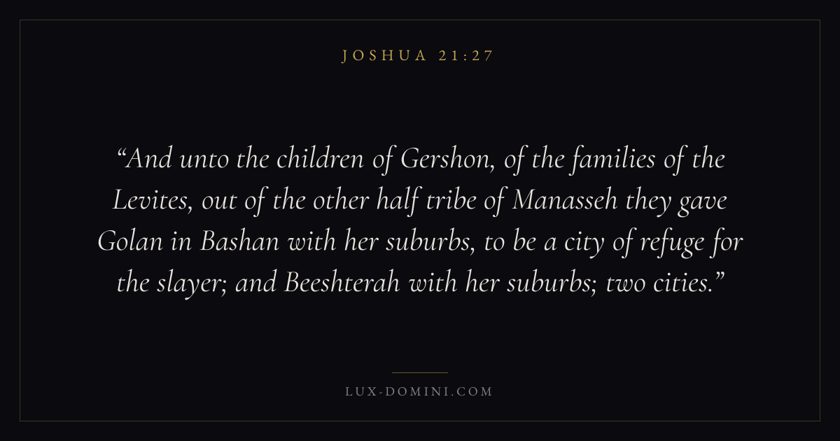 And unto the children of Gershon, of the families of the Levites, out of the other half tribe of Manasseh they gave Golan in Bashan with her suburbs, to be a city of refuge for the slayer; and Beeshterah with her suburbs; two cities.