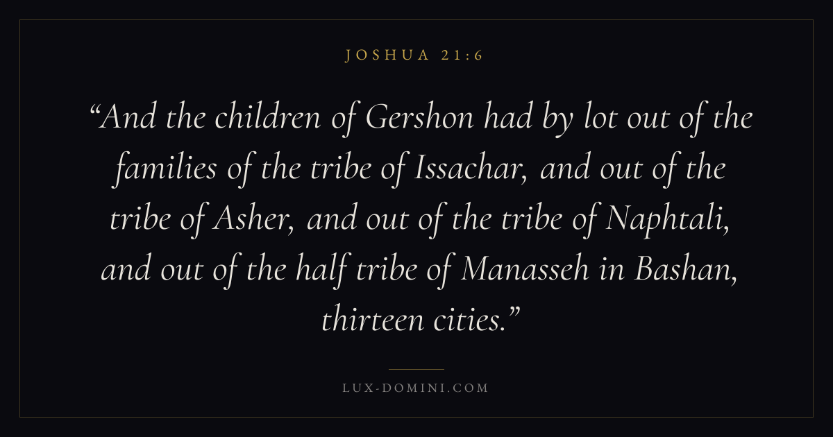 And the children of Gershon had by lot out of the families of the tribe of Issachar, and out of the tribe of Asher, and out of the tribe of Naphtali, and out of the half tribe of Manasseh in Bashan, thirteen cities.