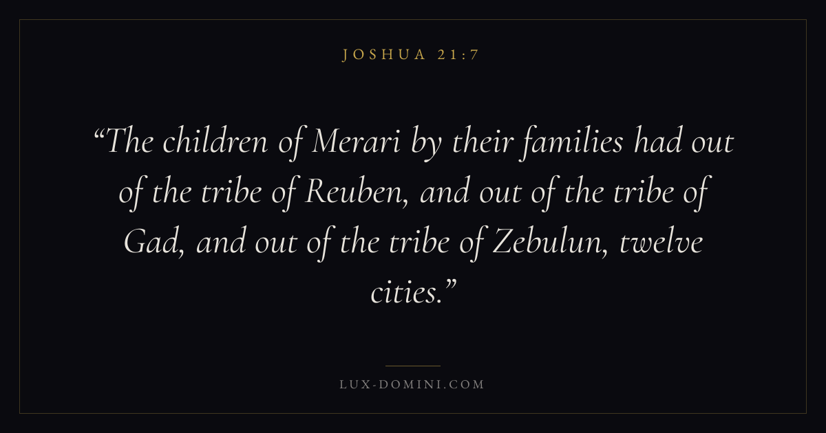 The children of Merari by their families had out of the tribe of Reuben, and out of the tribe of Gad, and out of the tribe of Zebulun, twelve cities.
