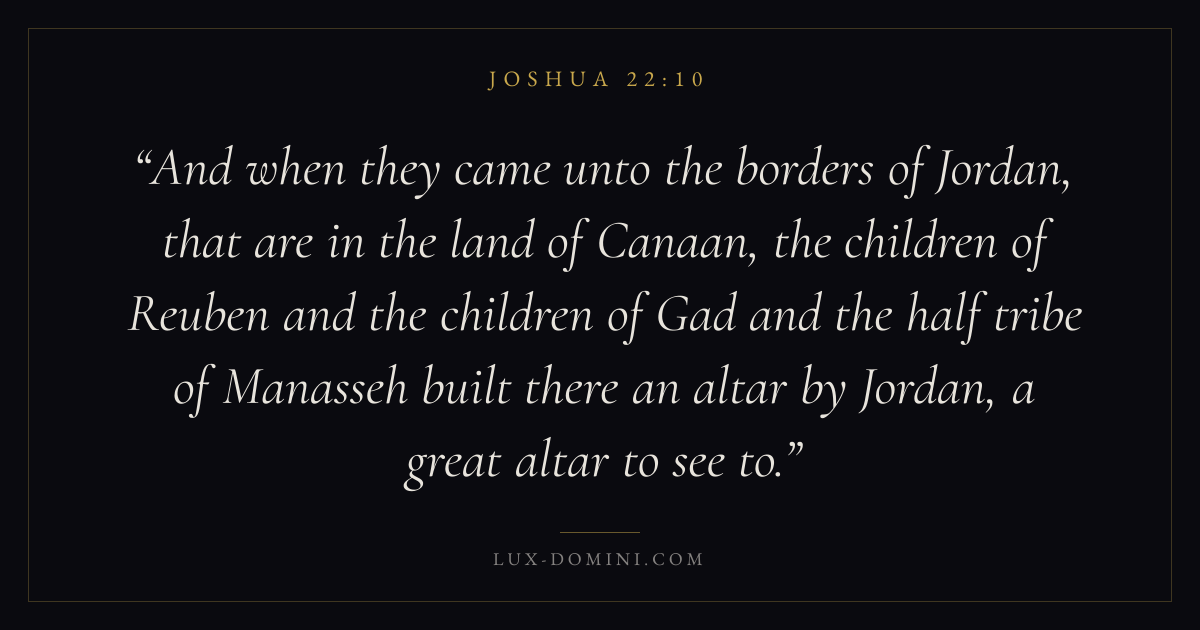 And when they came unto the borders of Jordan, that are in the land of Canaan, the children of Reuben and the children of Gad and the half tribe of Manasseh built there an altar by Jordan, a great altar to see to.
