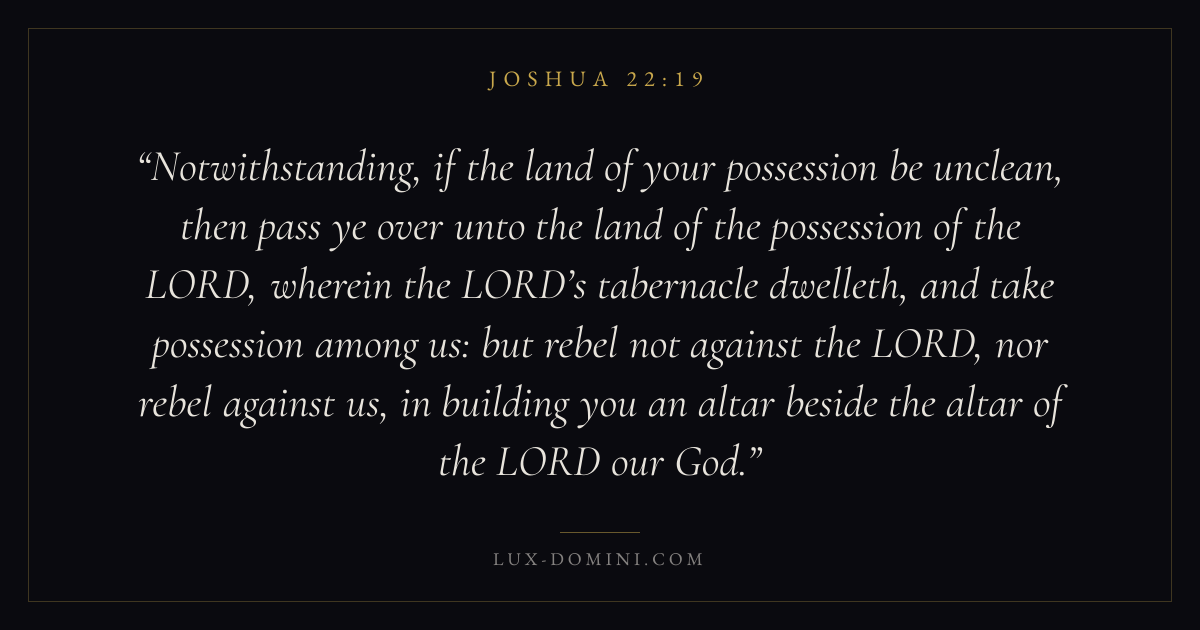 Notwithstanding, if the land of your possession be unclean, then pass ye over unto the land of the possession of the LORD, wherein the LORD’s tabernacle dwelleth, and take possession among us: but rebel not against the LORD, nor rebel against us, in building you an altar beside the altar of the LORD our God.