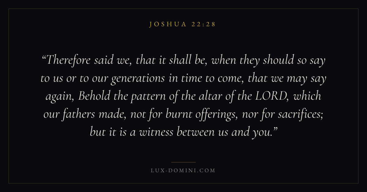 Therefore said we, that it shall be, when they should so say to us or to our generations in time to come, that we may say again, Behold the pattern of the altar of the LORD, which our fathers made, not for burnt offerings, nor for sacrifices; but it is a witness between us and you.