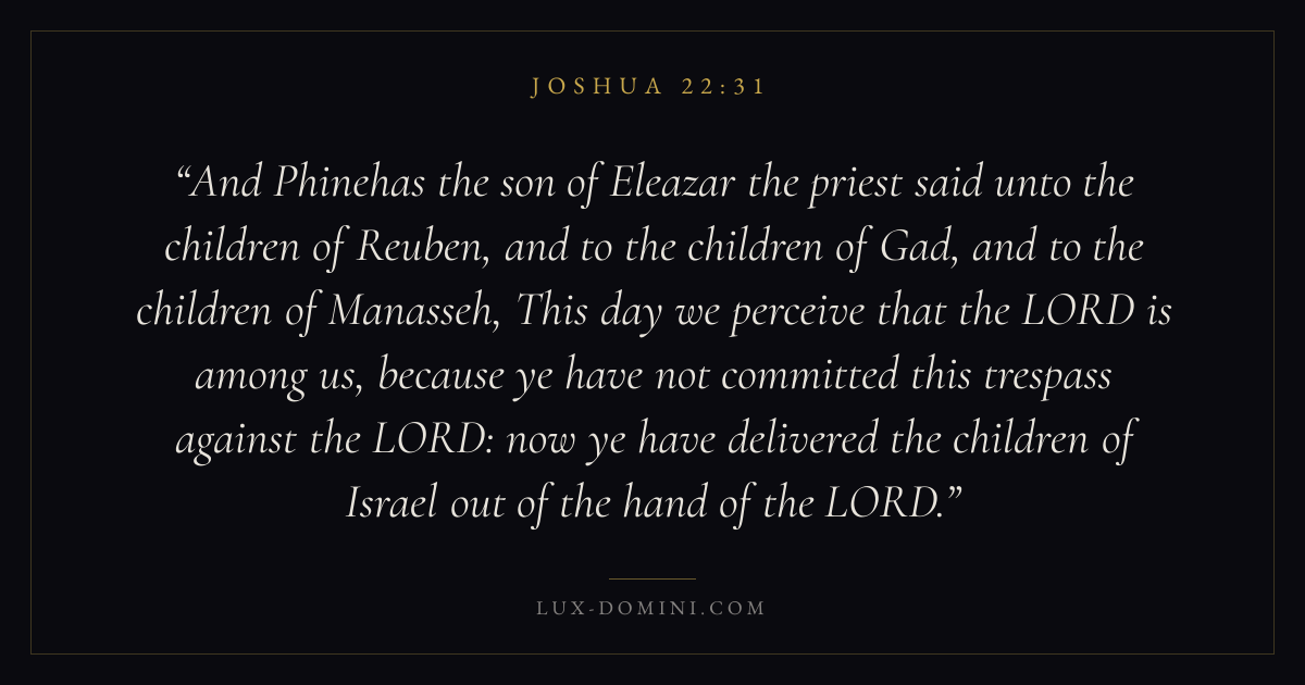 And Phinehas the son of Eleazar the priest said unto the children of Reuben, and to the children of Gad, and to the children of Manasseh, This day we perceive that the LORD is among us, because ye have not committed this trespass against the LORD: now ye have delivered the children of Israel out of the hand of the LORD.