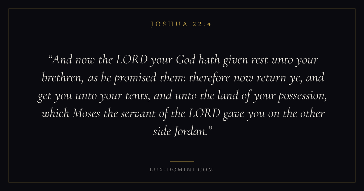 And now the LORD your God hath given rest unto your brethren, as he promised them: therefore now return ye, and get you unto your tents, and unto the land of your possession, which Moses the servant of the LORD gave you on the other side Jordan.