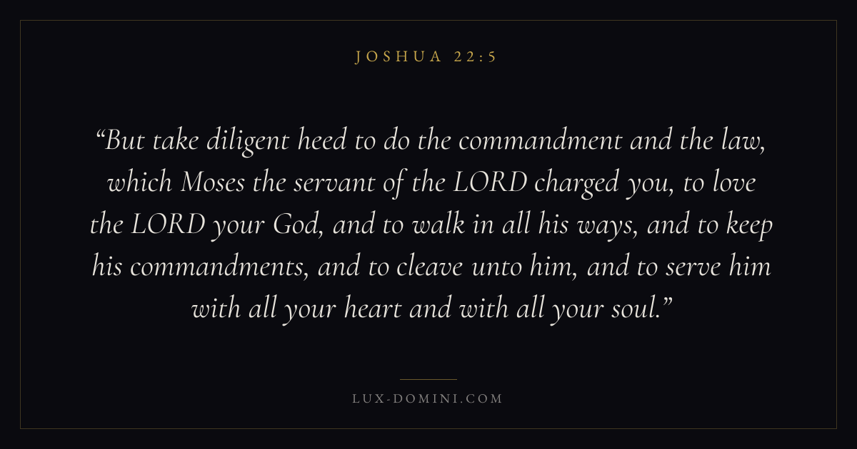 But take diligent heed to do the commandment and the law, which Moses the servant of the LORD charged you, to love the LORD your God, and to walk in all his ways, and to keep his commandments, and to cleave unto him, and to serve him with all your heart and with all your soul.
