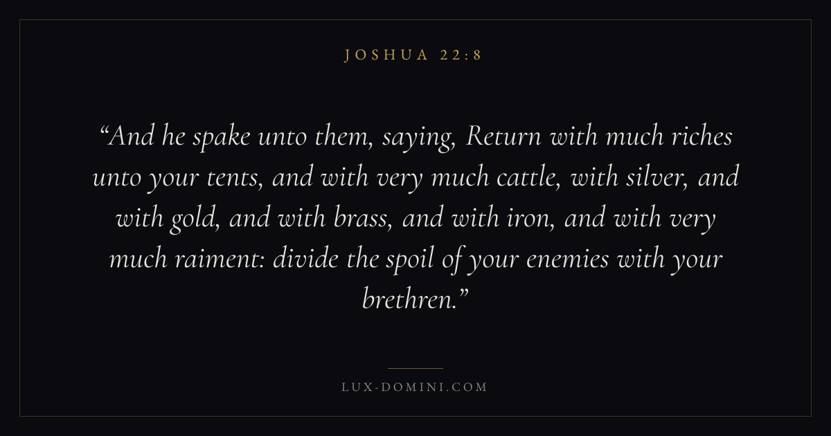 And he spake unto them, saying, Return with much riches unto your tents, and with very much cattle, with silver, and with gold, and with brass, and with iron, and with very much raiment: divide the spoil of your enemies with your brethren.