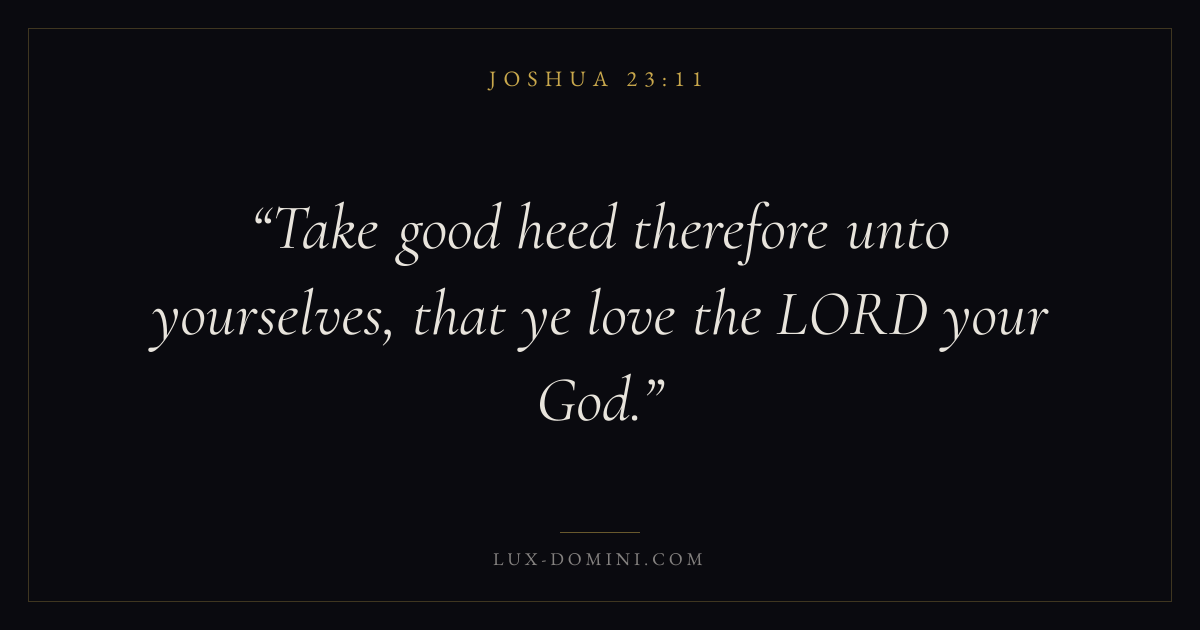 Books / Joshua / Chapter 23 / Verse 11 ← Joshua 23:10 Joshua 23:11 Joshua 23:12 → Take good heed therefore unto yourselves, that ye love the LORD your God. Download verse card Share on Twitter Share on Facebook Pin it ✦ Key themes LovePeaceInheritanceRest Read with Joshua 23:12Joshua 23:13John 3:161 Corinthians 13:4 Related topics Bible verses about loveBible verses about peaceBible verses about rest and weariness ✦ Joshua Chapter 23 verses V. 1 V. 2 V. 3 V. 4 V. 5 V. 6 V. 7 V. 8 V. 9 V. 10 V. 11 V. 12 V. 13 V. 14 V. 15 V. 16