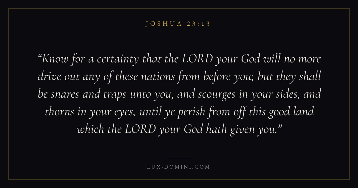 Know for a certainty that the LORD your God will no more drive out any of these nations from before you; but they shall be snares and traps unto you, and scourges in your sides, and thorns in your eyes, until ye perish from off this good land which the LORD your God hath given you.