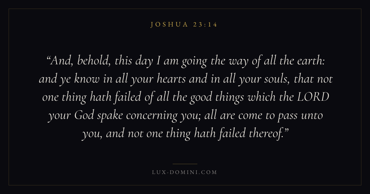 And, behold, this day I am going the way of all the earth: and ye know in all your hearts and in all your souls, that not one thing hath failed of all the good things which the LORD your God spake concerning you; all are come to pass unto you, and not one thing hath failed thereof.