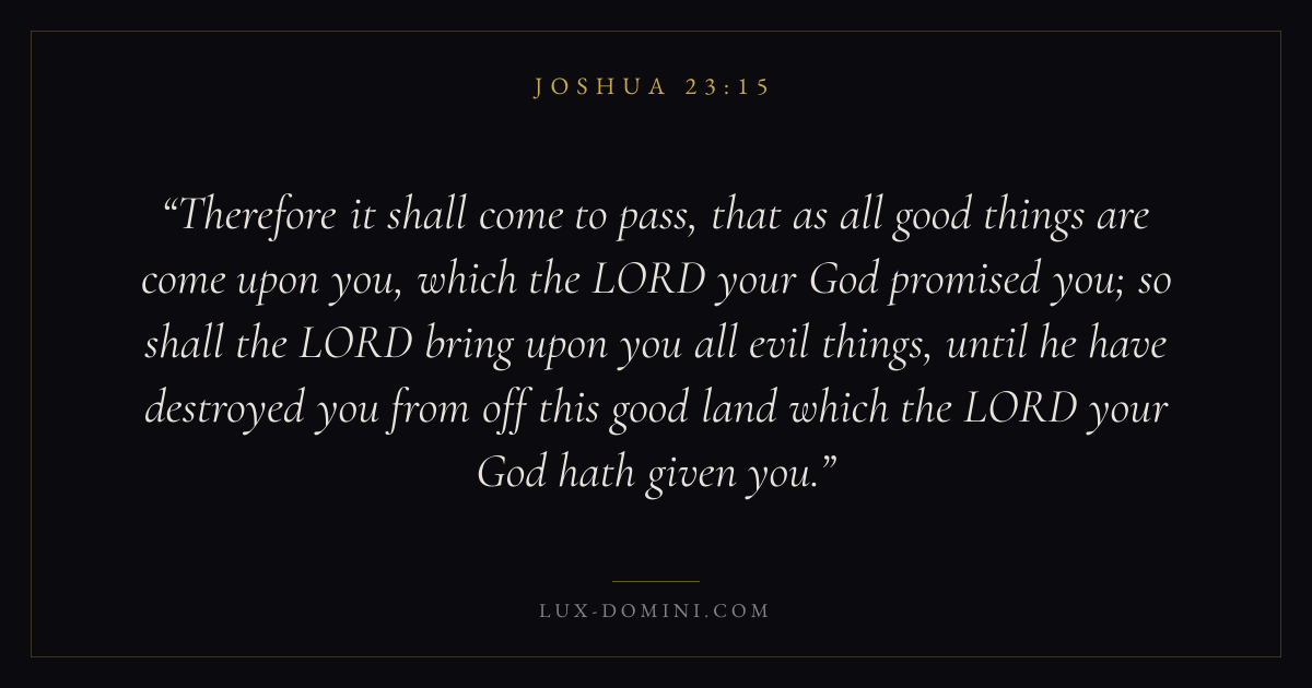 Therefore it shall come to pass, that as all good things are come upon you, which the LORD your God promised you; so shall the LORD bring upon you all evil things, until he have destroyed you from off this good land which the LORD your God hath given you.