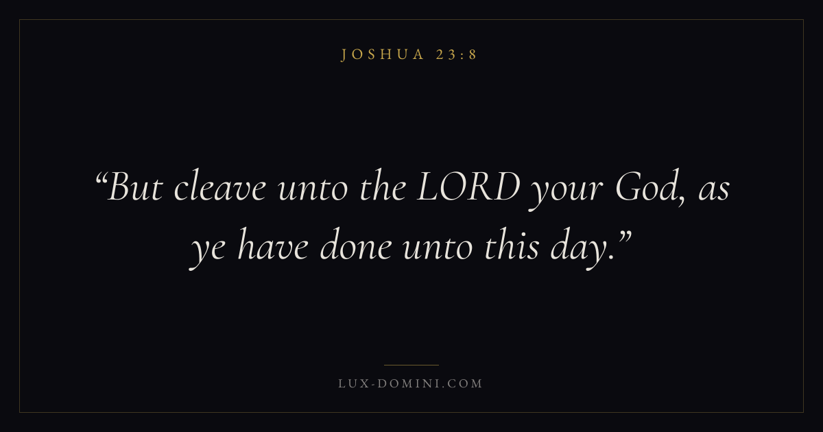 Books / Joshua / Chapter 23 / Verse 8 ← Joshua 23:7 Joshua 23:8 Joshua 23:9 → But cleave unto the LORD your God, as ye have done unto this day. Download verse card Share on Twitter Share on Facebook Pin it ✦ Key themes PeaceInheritanceRestCovenant fidelity Read with Joshua 23:6Joshua 23:7John 14:27Philippians 4:7 Related topics Bible verses about peaceBible verses about rest and weariness ✦ Joshua Chapter 23 verses V. 1 V. 2 V. 3 V. 4 V. 5 V. 6 V. 7 V. 8 V. 9 V. 10 V. 11 V. 12 V. 13 V. 14 V. 15 V. 16