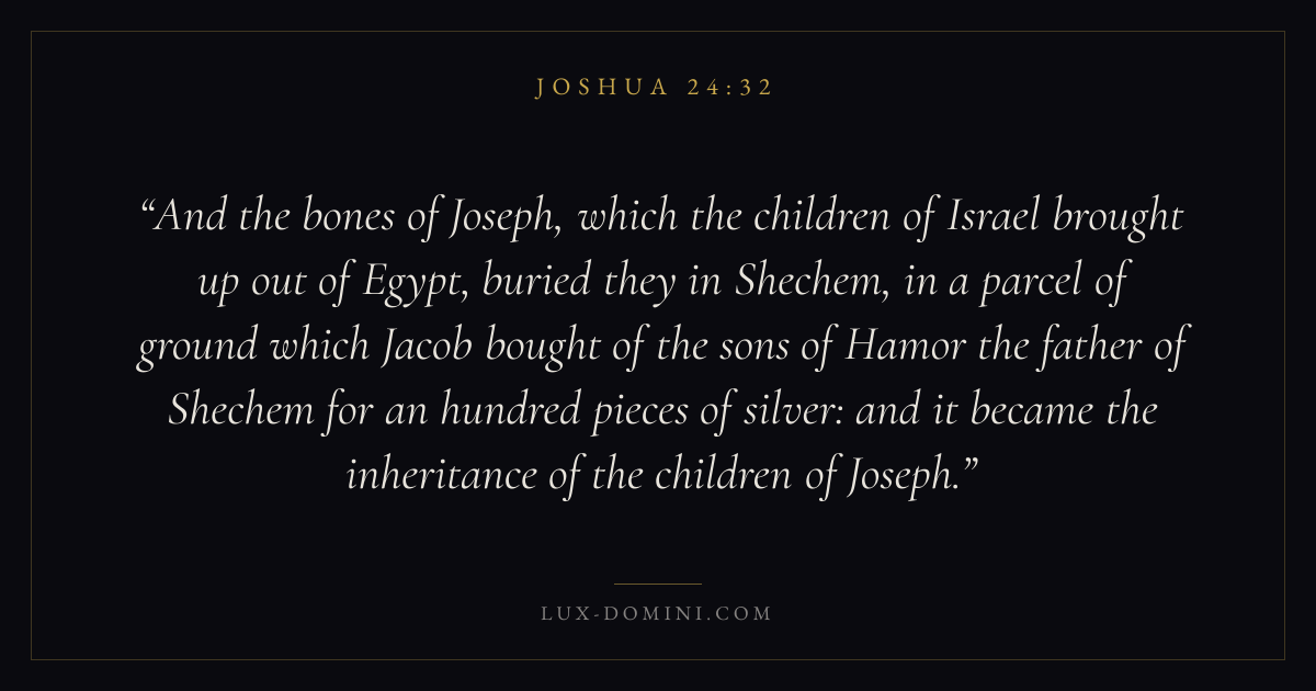 And the bones of Joseph, which the children of Israel brought up out of Egypt, buried they in Shechem, in a parcel of ground which Jacob bought of the sons of Hamor the father of Shechem for an hundred pieces of silver: and it became the inheritance of the children of Joseph.