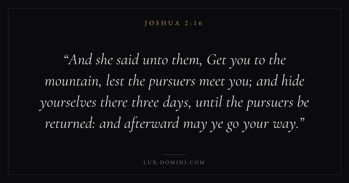 And she said unto them, Get you to the mountain, lest the pursuers meet you; and hide yourselves there three days, until the pursuers be returned: and afterward may ye go your way.