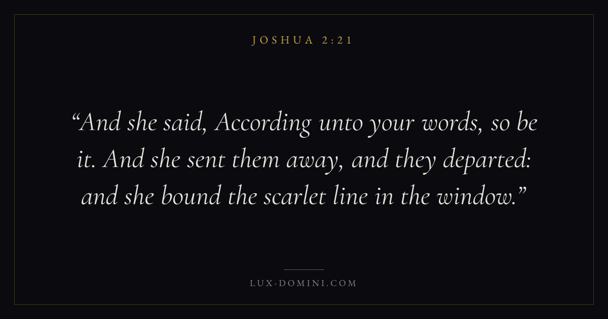 And she said, According unto your words, so be it. And she sent them away, and they departed: and she bound the scarlet line in the window.