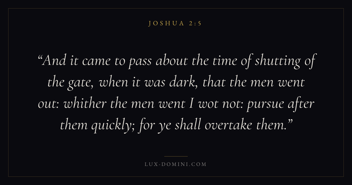 And it came to pass about the time of shutting of the gate, when it was dark, that the men went out: whither the men went I wot not: pursue after them quickly; for ye shall overtake them.