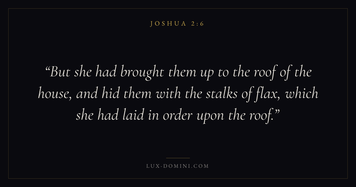 But she had brought them up to the roof of the house, and hid them with the stalks of flax, which she had laid in order upon the roof.