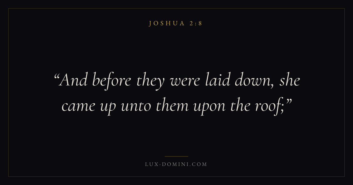 Books / Joshua / Chapter 2 / Verse 8 ← Joshua 2:7 Joshua 2:8 Joshua 2:9 → And before they were laid down, she came up unto them upon the roof; Download verse card Share on Twitter Share on Facebook Pin it ✦ Key themes PeaceInheritanceRestCovenant fidelity Read with Joshua 2:9Joshua 2:10John 14:27Philippians 4:7 Related topics Bible verses about peaceBible verses about rest and weariness ✦ Joshua Chapter 2 verses V. 1 V. 2 V. 3 V. 4 V. 5 V. 6 V. 7 V. 8 V. 9 V. 10 V. 11 V. 12 V. 13 V. 14 V. 15 V. 16 V. 17 V. 18 V. 19 V. 20 V. 21 V. 22 V. 23 V. 24