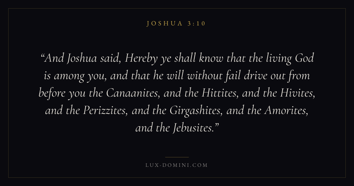 And Joshua said, Hereby ye shall know that the living God is among you, and that he will without fail drive out from before you the Canaanites, and the Hittites, and the Hivites, and the Perizzites, and the Girgashites, and the Amorites, and the Jebusites.