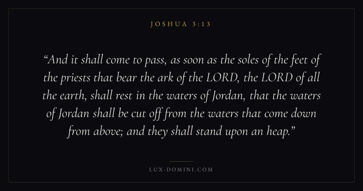 And it shall come to pass, as soon as the soles of the feet of the priests that bear the ark of the LORD, the LORD of all the earth, shall rest in the waters of Jordan, that the waters of Jordan shall be cut off from the waters that come down from above; and they shall stand upon an heap.