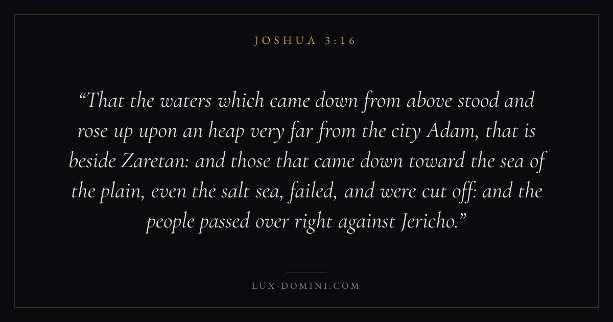That the waters which came down from above stood and rose up upon an heap very far from the city Adam, that is beside Zaretan: and those that came down toward the sea of the plain, even the salt sea, failed, and were cut off: and the people passed over right against Jericho.