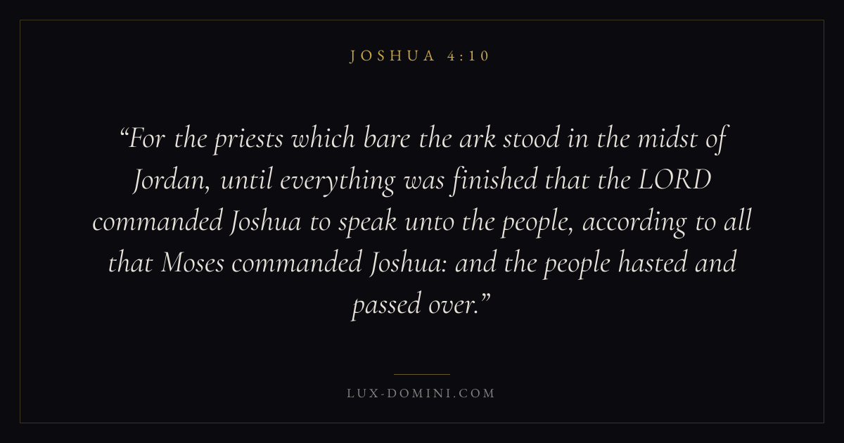 For the priests which bare the ark stood in the midst of Jordan, until everything was finished that the LORD commanded Joshua to speak unto the people, according to all that Moses commanded Joshua: and the people hasted and passed over.