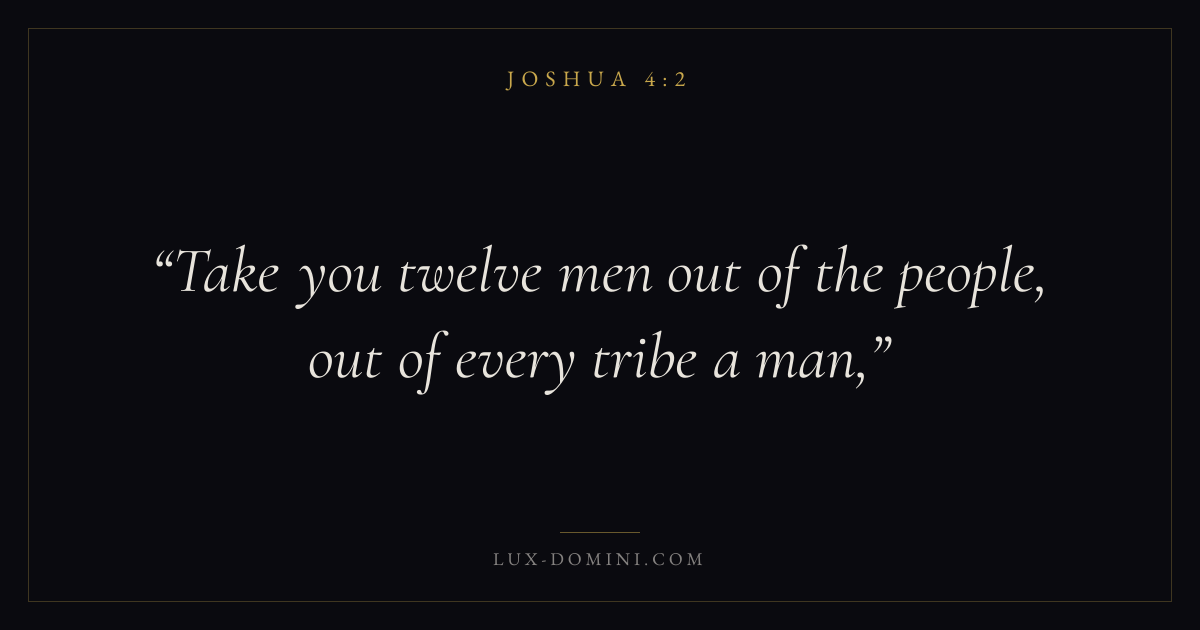 Books / Joshua / Chapter 4 / Verse 2 ← Joshua 4:1 Joshua 4:2 Joshua 4:3 → Take you twelve men out of the people, out of every tribe a man, Download verse card Share on Twitter Share on Facebook Pin it ✦ Key themes PeaceInheritanceRestCovenant fidelity Read with Joshua 4:1Joshua 4:3John 14:27Philippians 4:7 Related topics Bible verses about peaceBible verses about rest and weariness ✦ Joshua Chapter 4 verses V. 1 V. 2 V. 3 V. 4 V. 5 V. 6 V. 7 V. 8 V. 9 V. 10 V. 11 V. 12 V. 13 V. 14 V. 15 V. 16 V. 17 V. 18 V. 19 V. 20 V. 21 V. 22 V. 23 V. 24