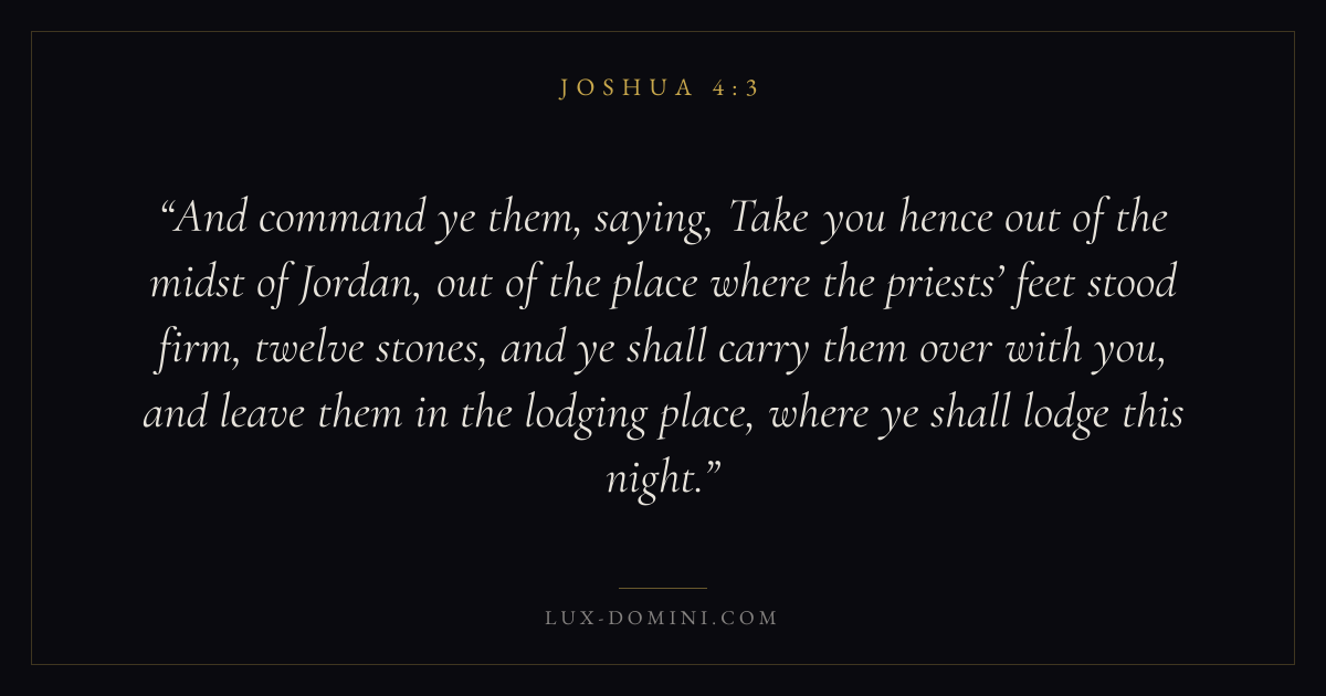 And command ye them, saying, Take you hence out of the midst of Jordan, out of the place where the priests’ feet stood firm, twelve stones, and ye shall carry them over with you, and leave them in the lodging place, where ye shall lodge this night.