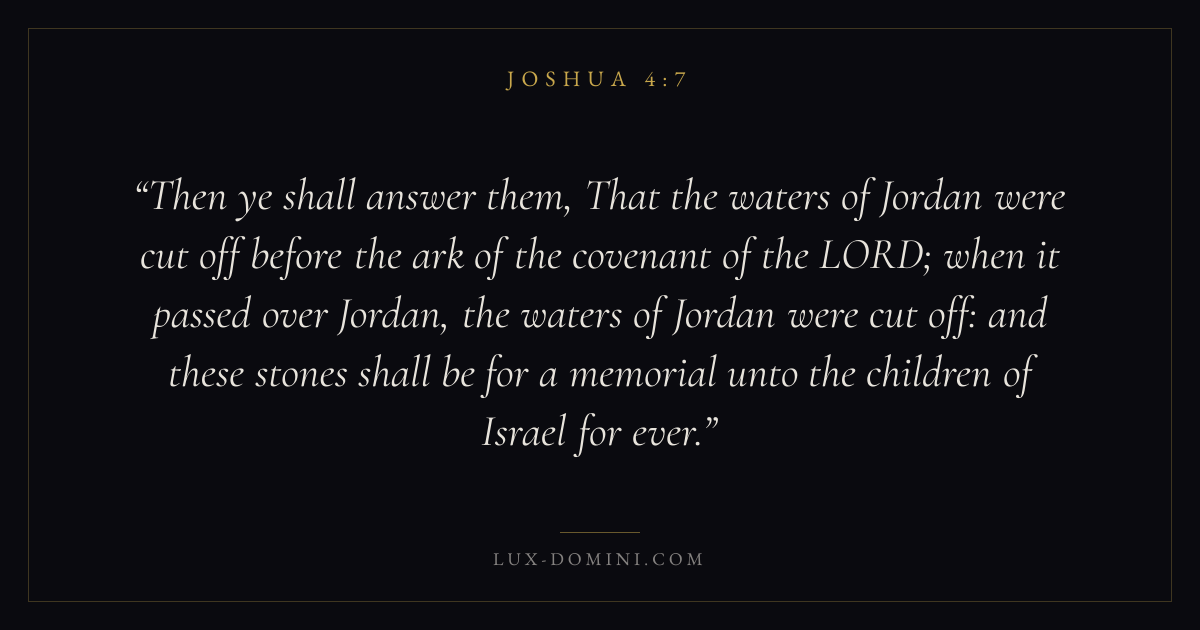 Then ye shall answer them, That the waters of Jordan were cut off before the ark of the covenant of the LORD; when it passed over Jordan, the waters of Jordan were cut off: and these stones shall be for a memorial unto the children of Israel for ever.