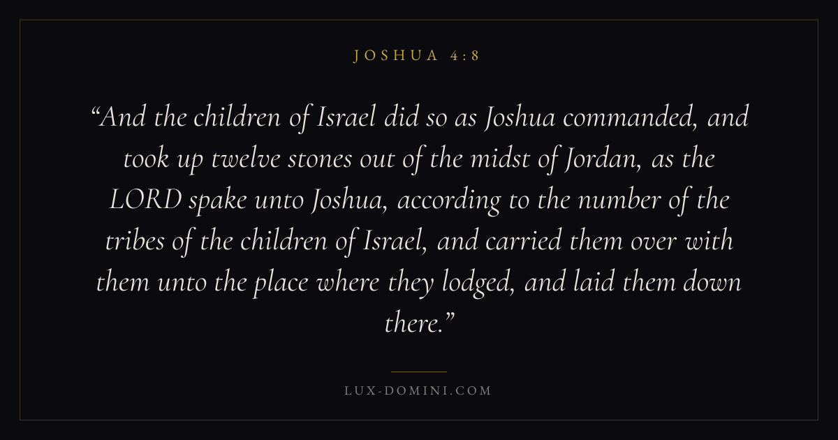 And the children of Israel did so as Joshua commanded, and took up twelve stones out of the midst of Jordan, as the LORD spake unto Joshua, according to the number of the tribes of the children of Israel, and carried them over with them unto the place where they lodged, and laid them down there.