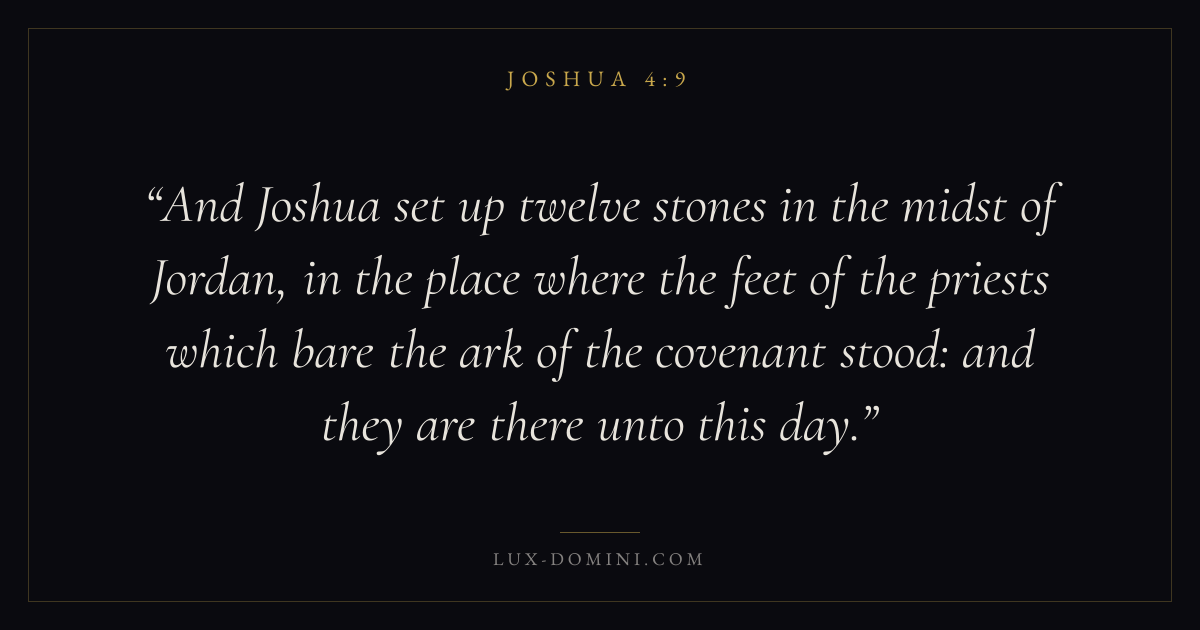 And Joshua set up twelve stones in the midst of Jordan, in the place where the feet of the priests which bare the ark of the covenant stood: and they are there unto this day.