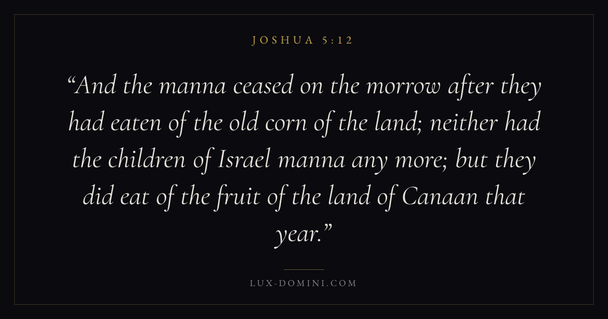 And the manna ceased on the morrow after they had eaten of the old corn of the land; neither had the children of Israel manna any more; but they did eat of the fruit of the land of Canaan that year.