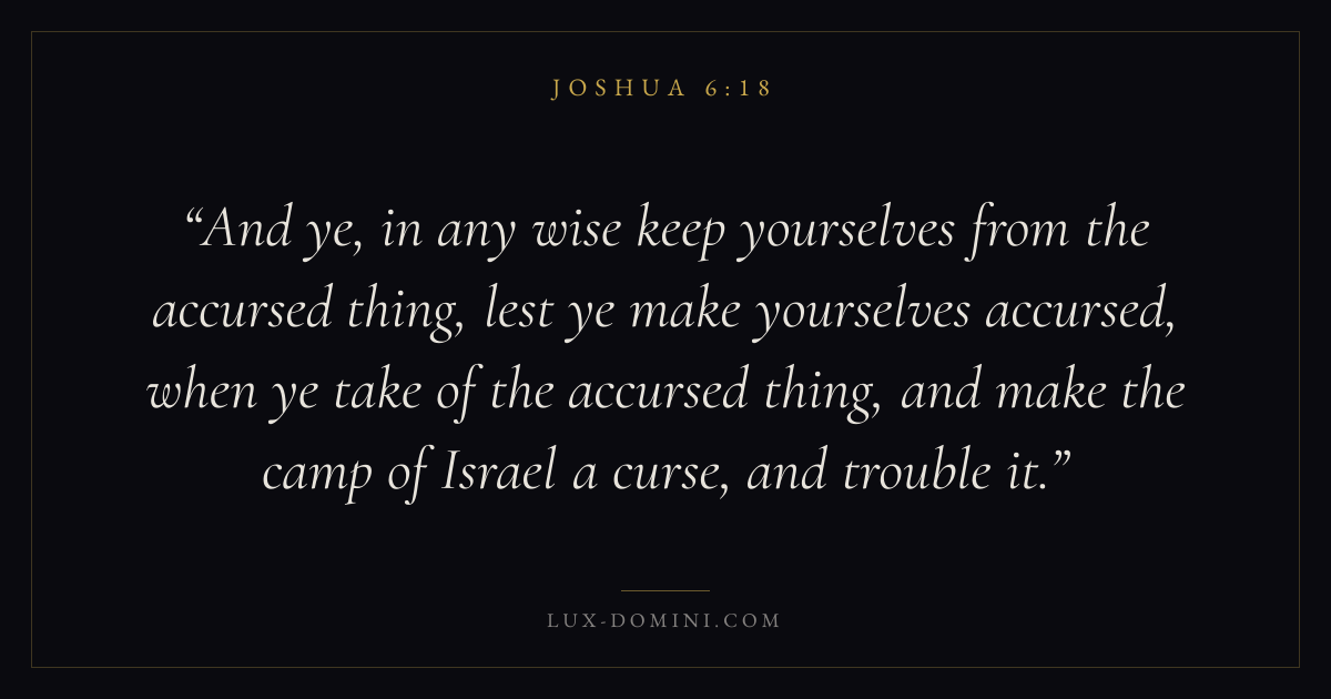 And ye, in any wise keep yourselves from the accursed thing, lest ye make yourselves accursed, when ye take of the accursed thing, and make the camp of Israel a curse, and trouble it.