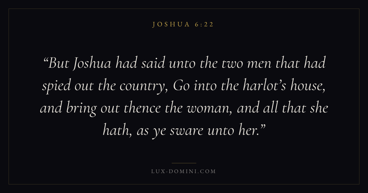 But Joshua had said unto the two men that had spied out the country, Go into the harlot’s house, and bring out thence the woman, and all that she hath, as ye sware unto her.