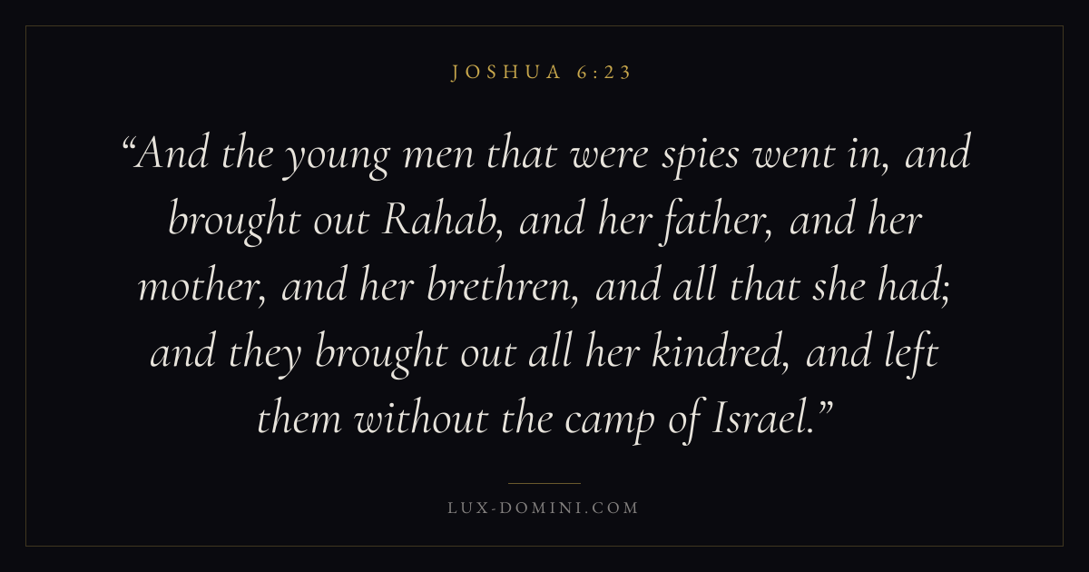 And the young men that were spies went in, and brought out Rahab, and her father, and her mother, and her brethren, and all that she had; and they brought out all her kindred, and left them without the camp of Israel.