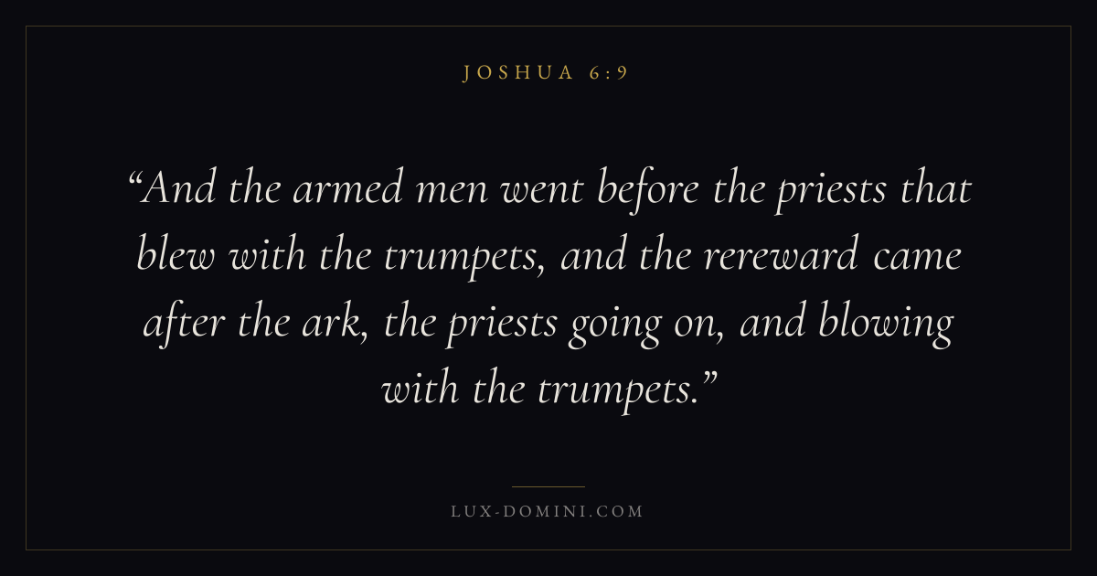 And the armed men went before the priests that blew with the trumpets, and the rereward came after the ark, the priests going on, and blowing with the trumpets.