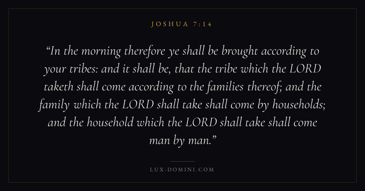 In the morning therefore ye shall be brought according to your tribes: and it shall be, that the tribe which the LORD taketh shall come according to the families thereof; and the family which the LORD shall take shall come by households; and the household which the LORD shall take shall come man by man.